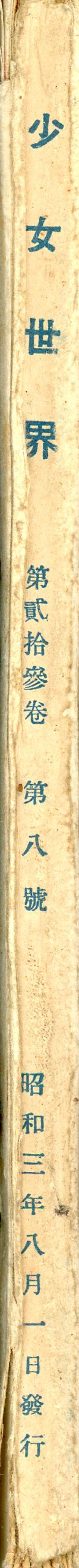| 「少女世界」は、博文館から1906年(明治39年)1月に創刊した少女向け総合雑誌。 1931年12月休刊。 (注)表紙欠け。 |